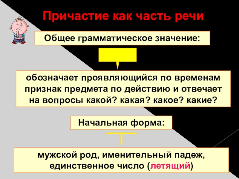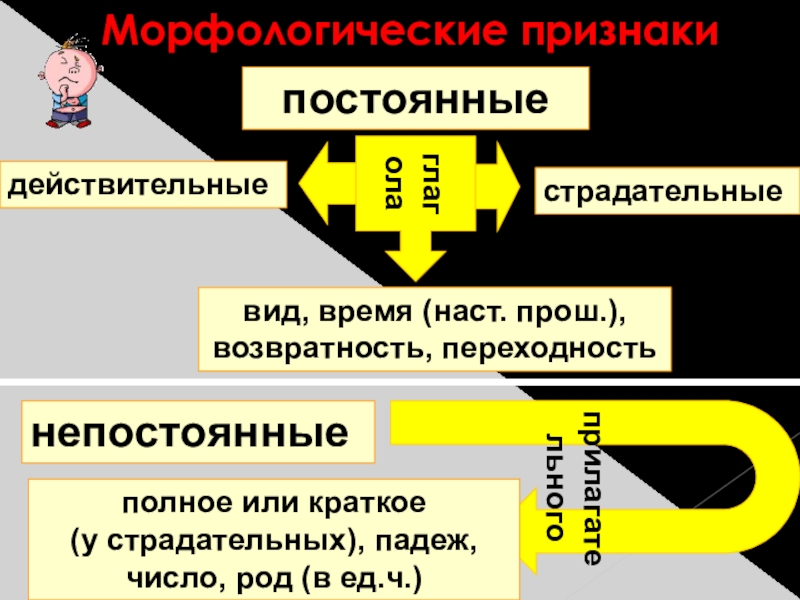 полное или краткое (у страдательных), падеж, число, род (в ед.ч.)