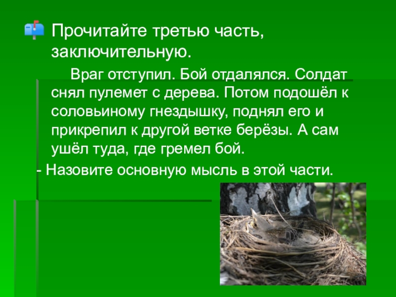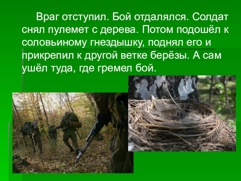 Враг отступил. Бой отдалялся. Солдат снял пулемет с дерева. Потом подошёл к соловьиному гнездышку, поднял его и прикрепил к другой ветке берёзы. А сам ушёл туда, где гремел бой.