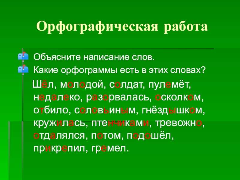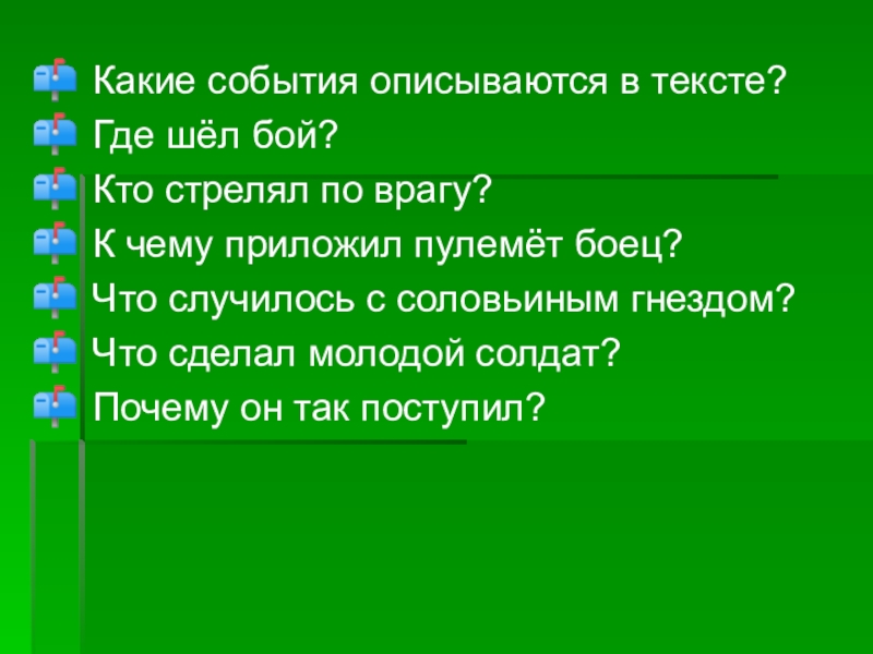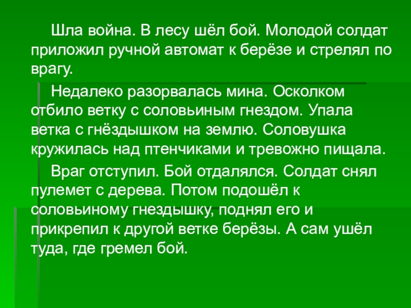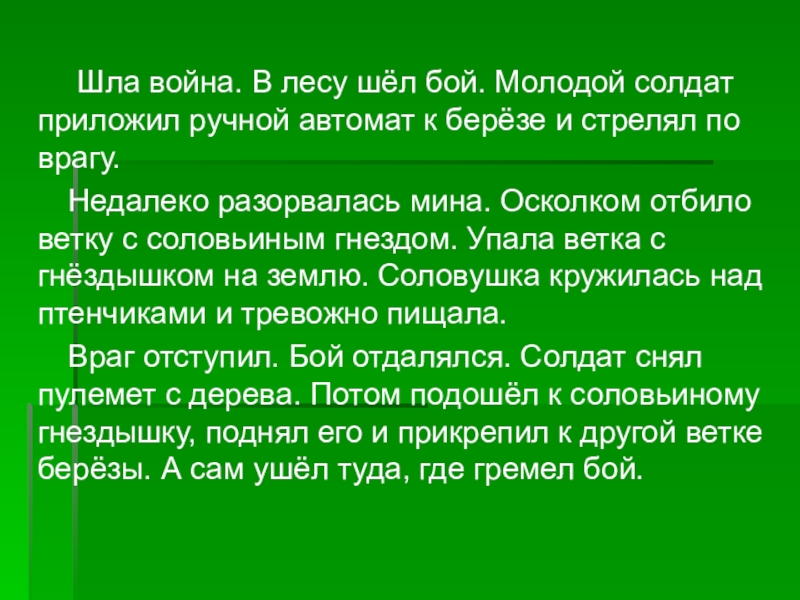 Шёл, молодой, солдат, пулемёт, недалеко, разорвалась, осколком, отбило, соловьиным, гнёздышком, кружилась, птенчиками, тревожно, отдалялся, потом, подошёл, прикрепил, гремел.