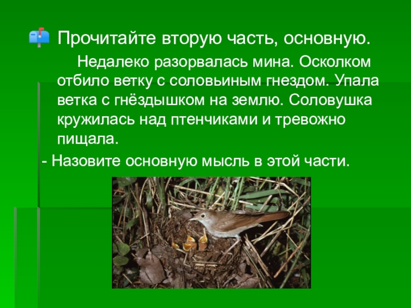 Недалеко разорвалась мина. Осколком отбило ветку с соловьиным гнездом. Упала ветка с гнёздышком на землю. Соловушка кружилась над птенчиками и тревожно пищала.