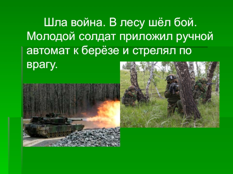 Шла война. В лесу шёл бой. Молодой солдат приложил ручной автомат к берёзе и стрелял по врагу.