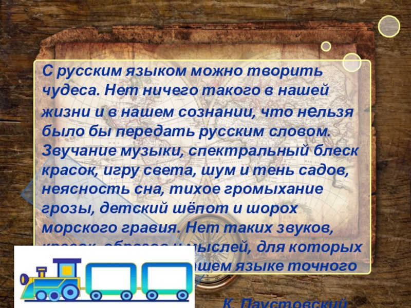 жизни и в нашем сознании, что нельзя было бы передать русским словом. Звучание музыки, спектральный блеск красок, игру света, шум и тень садов, неясность сна, тихое громыхание грозы, детский шёпот и шорох морского гравия. Нет таких звуков, красок, образов и мыслей, для которых не нашлось бы в нашем языке точного выражения.