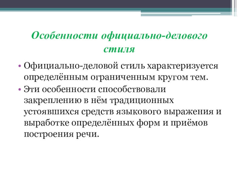 Официально-деловой стиль характеризуется определённым ограниченным кругом тем.