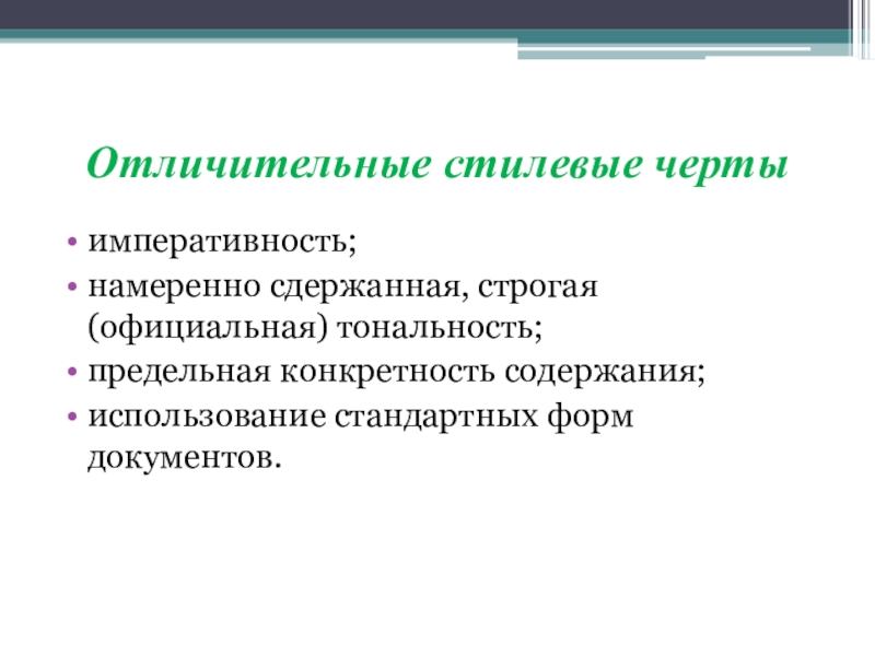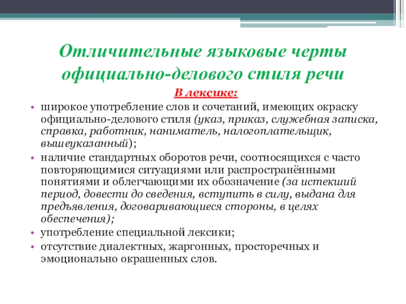 Слайд 8Отличительные языковые черты официально-делового стиля речи