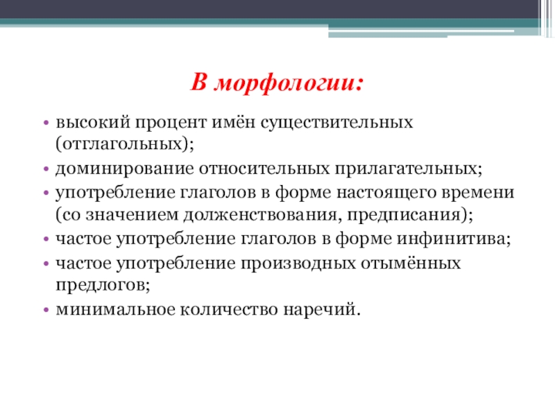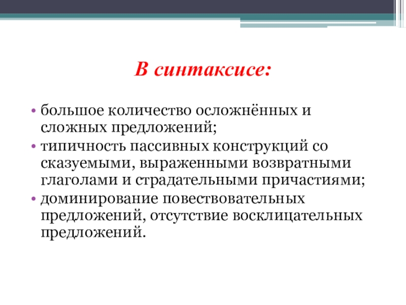 доминирование повествовательных предложений, отсутствие восклицательных предложений.