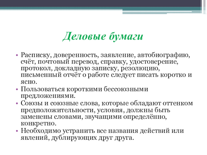 Расписку, доверенность, заявление, автобиографию, счёт, почтовый перевод, справку, удостоверение, протокол,