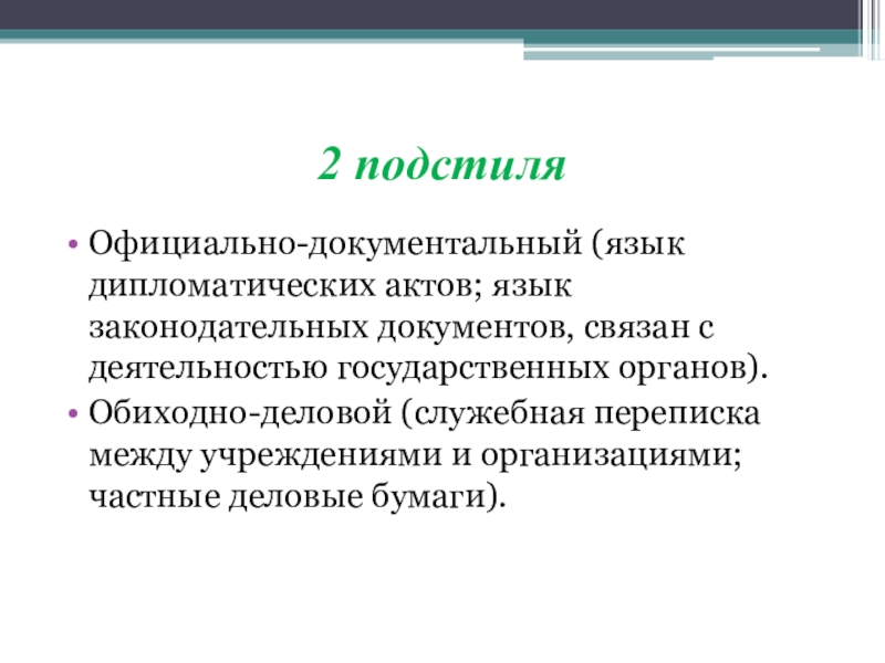 Официально-документальный (язык дипломатических актов; язык законодательных документов, связан с деятельностью