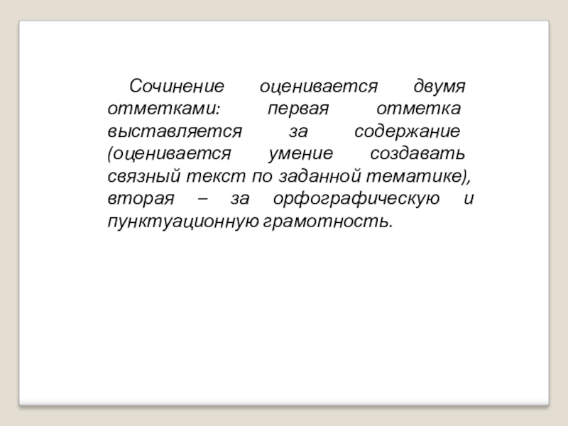 Слайд 14Сочинение оценивается двумя отметками: первая отметка выставляется за содержание (оценивается умение