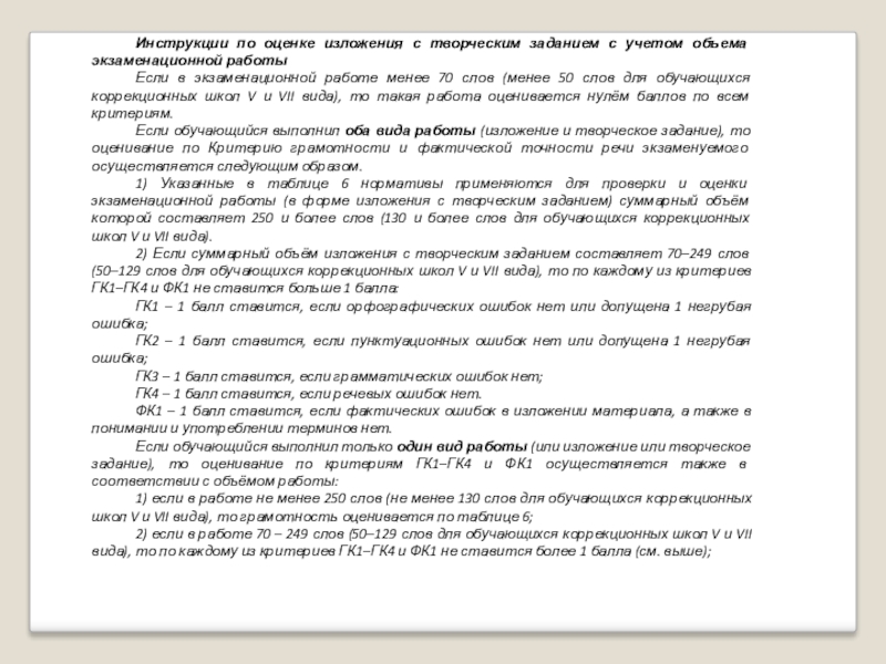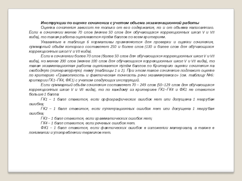 Если в сочинении более 70 слов (более 50 слов для обучающихся коррекционных школ V и VII вида), но менее 200 слов (менее 100 слов для обучающихся коррекционных школ V и VII вида), то такая экзаменационная работа оценивается нулём баллов по Критерию оценки сочинения на свободную (литературную) тему (таблицы 1 и 2). При этом такое сочинение подлежит оценке по критерию «Грамотность и фактическая точность речи экзаменуемого» (см. таблицу №6: критерии ГК1–ГК4, ФК1) с учетом следующих инструкций.
