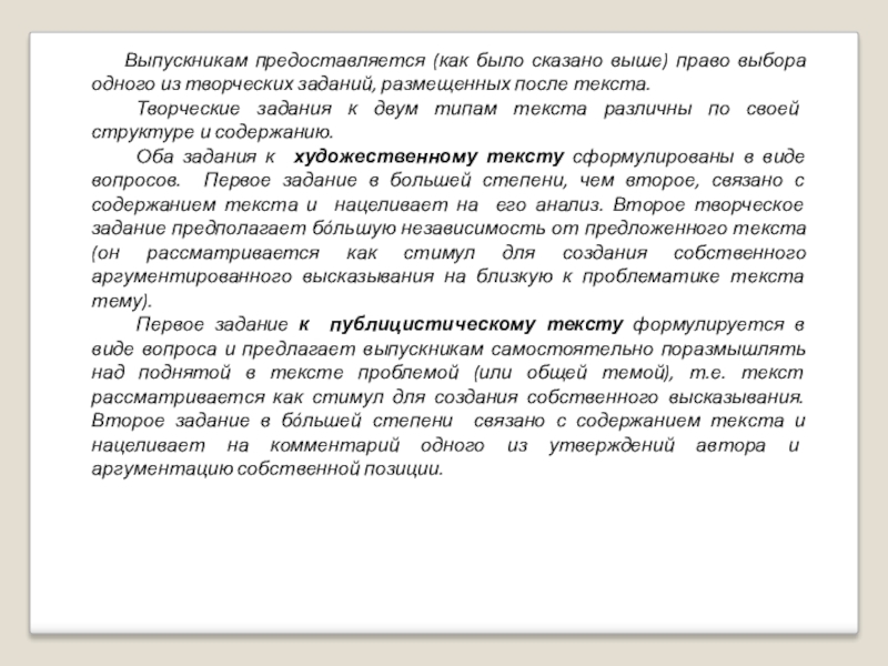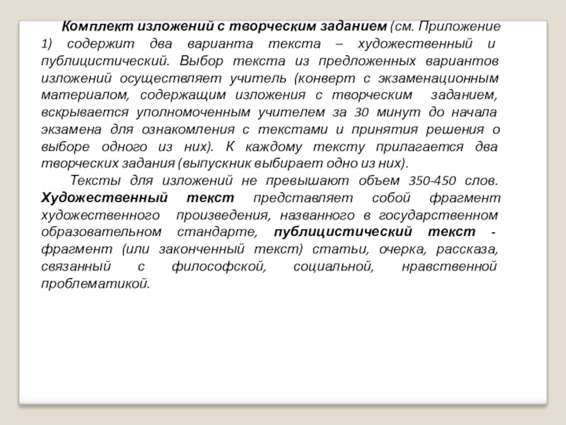 текста – художественный и публицистический. Выбор текста из предложенных вариантов изложений осуществляет учитель (конверт с экзаменационным материалом, содержащим изложения с творческим заданием, вскрывается уполномоченным учителем за 30 минут до начала экзамена для ознакомления с текстами и принятия решения о выборе одного из них). К каждому тексту прилагается два творческих задания (выпускник выбирает одно из них).