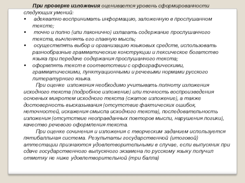 При оценке изложения необходимо учитывать полноту изложения исходного текста (подробное изложение) или точность воспроизведения основных микротем исходного текста (сжатое изложение), а также достоверность высказывания (отсутствие фактических ошибок, неточностей, искажения смысла исходного текста), последовательность изложения (отсутствие неоправданных повторов мысли, нарушения логики), качество речевого оформления текста.