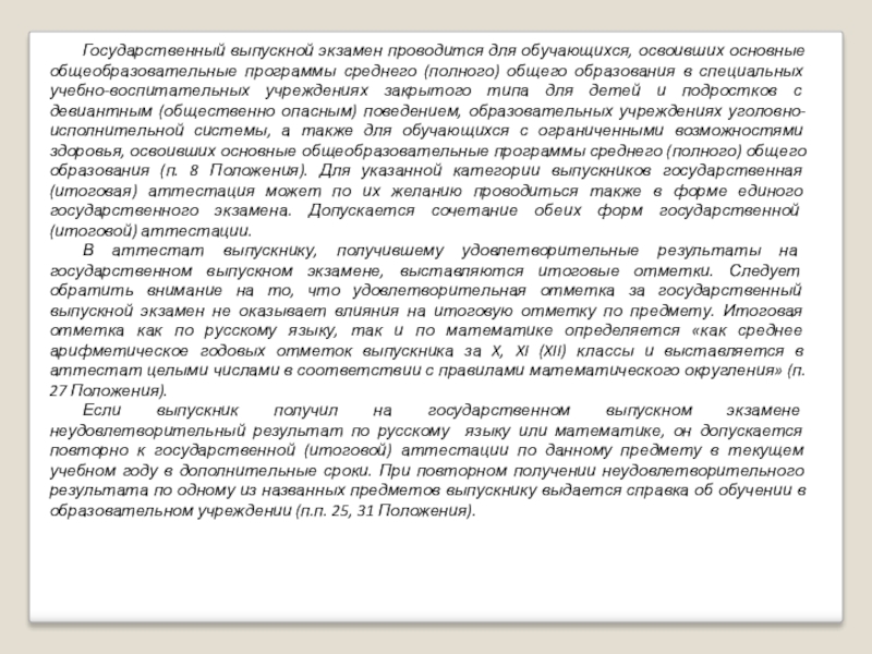 (полного) общего образования в специальных учебно-воспитательных учреждениях закрытого типа для детей и подростков с девиантным (общественно опасным) поведением, образовательных учреждениях уголовно-исполнительной системы, а также для обучающихся с ограниченными возможностями здоровья, освоивших основные общеобразовательные программы среднего (полного) общего образования (п. 8 Положения). Для указанной категории выпускников государственная (итоговая) аттестация может по их желанию проводиться также в форме единого государственного экзамена. Допускается сочетание обеих форм государственной (итоговой) аттестации.