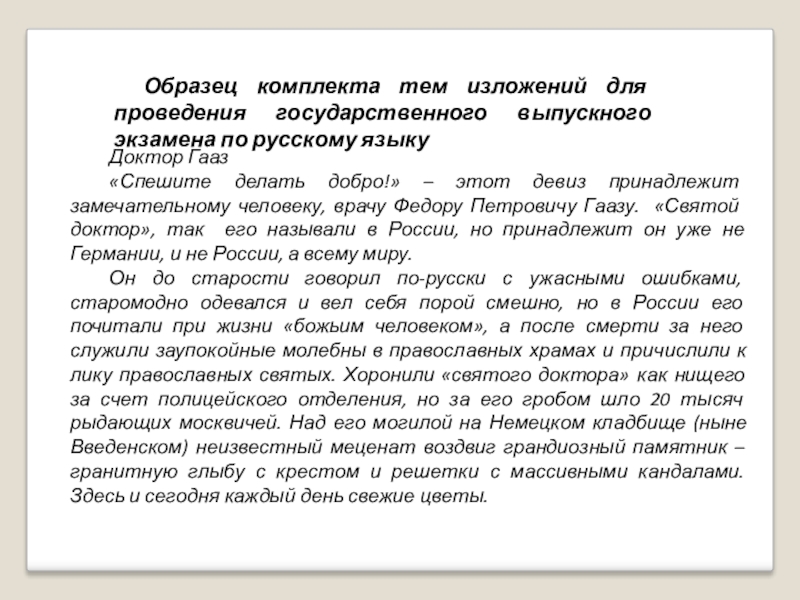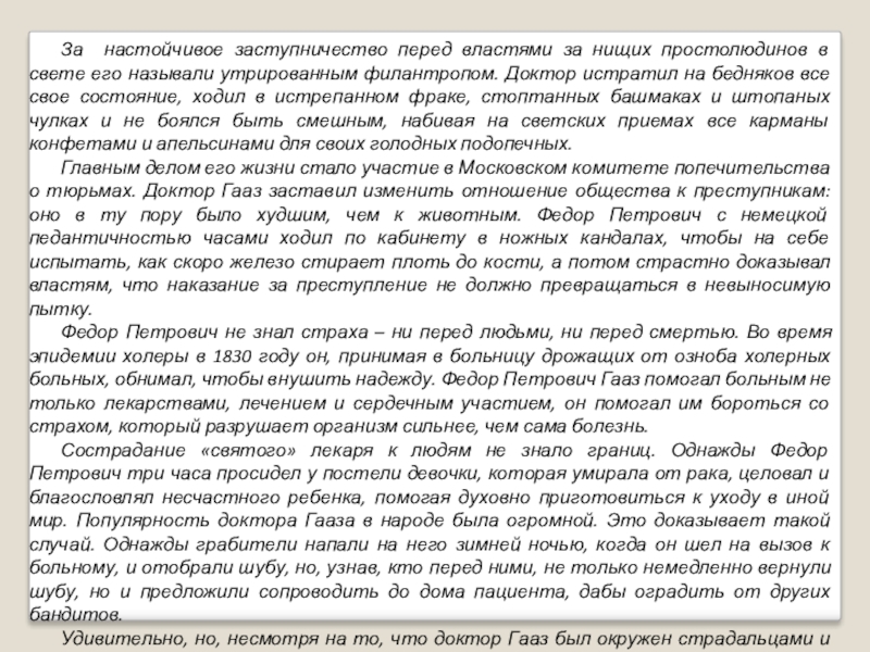 Удивительно, но, несмотря на то, что доктор Гааз был окружен страдальцами и бедняками, да и сам жил в бедности, он чувствовал себя абсолютно счастливым человеком…(По Н.А.Севидовой) (401 слово)