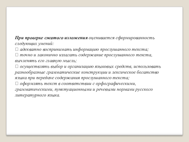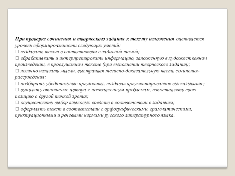 Слайд 13При проверке изложения оценивается уровень сформированности следующих умений: