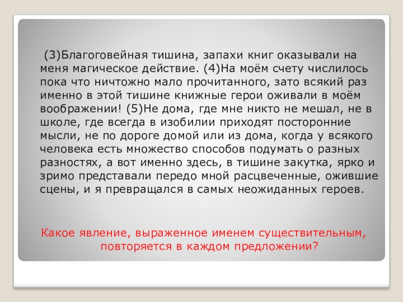 (3)Благоговейная тишина, запахи книг оказывали на меня магическое действие. (4)На моём счету числилось пока что ничтожно мало прочитанного, зато всякий раз именно в этой тишине книжные герои оживали в моём воображении! (5)Не дома, где мне никто не мешал, не в школе, где всегда в изобилии приходят посторонние мысли, не по дороге домой или из дома, когда у всякого человека есть множество способов подумать о разных разностях, а вот именно здесь, в тишине закутка, ярко и зримо представали передо мной расцвеченные, ожившие сцены, и я превращался в самых неожиданных героев.