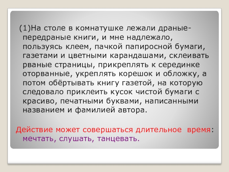 (1)На столе в комнатушке лежали драные-передраные книги, и мне надлежало,