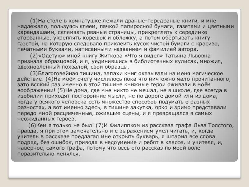 (4)На моём счету числилось пока что ничтожно мало прочитанного, зато всякий раз именно в этой тишине книжные герои оживали в моём воображении! (5)Не дома, где мне никто не мешал, не в школе, где всегда в изобилии приходят посторонние мысли, не по дороге домой или из дома, когда у всякого человека есть множество способов подумать о разных разностях, а вот именно здесь, в тишине закутка, ярко и зримо представали передо мной расцвеченные, ожившие сцены, и я превращался в самых неожиданных героев.