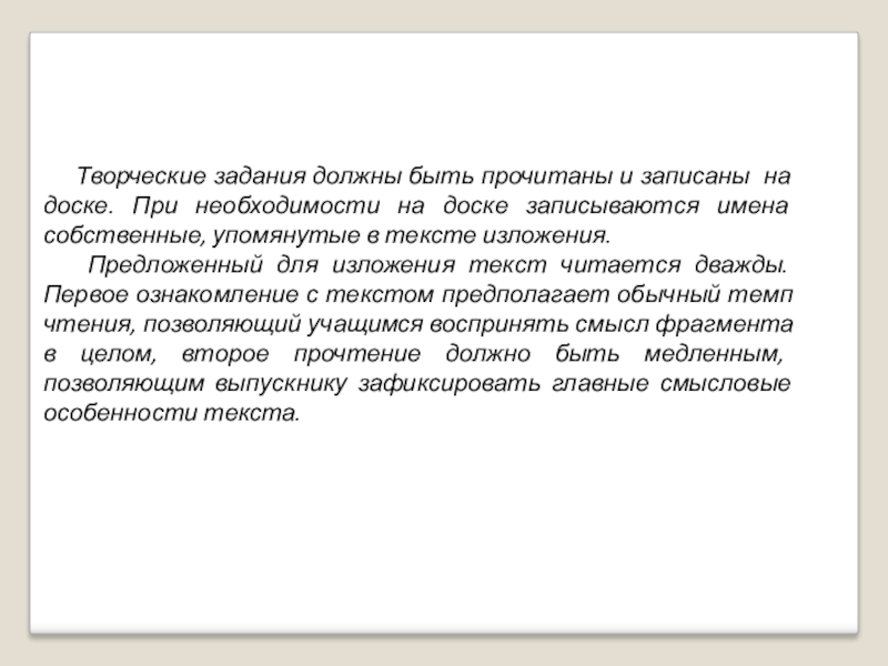 Предложенный для изложения текст читается дважды. Первое ознакомление с текстом предполагает обычный темп чтения, позволяющий учащимся воспринять смысл фрагмента в целом, второе прочтение должно быть медленным, позволяющим выпускнику зафиксировать главные смысловые особенности текста.