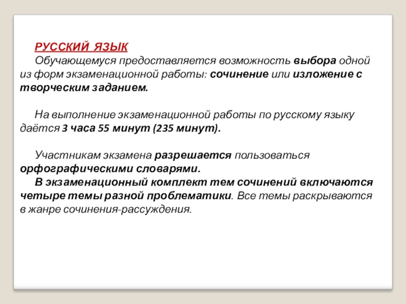 На выполнение экзаменационной работы по русскому языку даётся 3 часа 55 минут (235 минут).