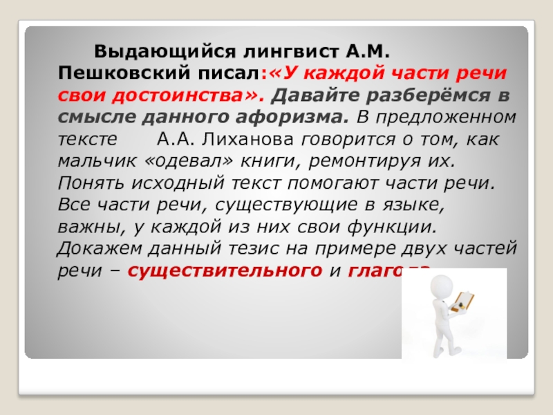 речи свои достоинства». Давайте разберёмся в смысле данного афоризма. В предложенном тексте А.А. Лиханова говорится о том, как мальчик «одевал» книги, ремонтируя их. Понять исходный текст помогают части речи. Все части речи, существующие в языке, важны, у каждой из них свои функции. Докажем данный тезис на примере двух частей речи – существительного и глагола.