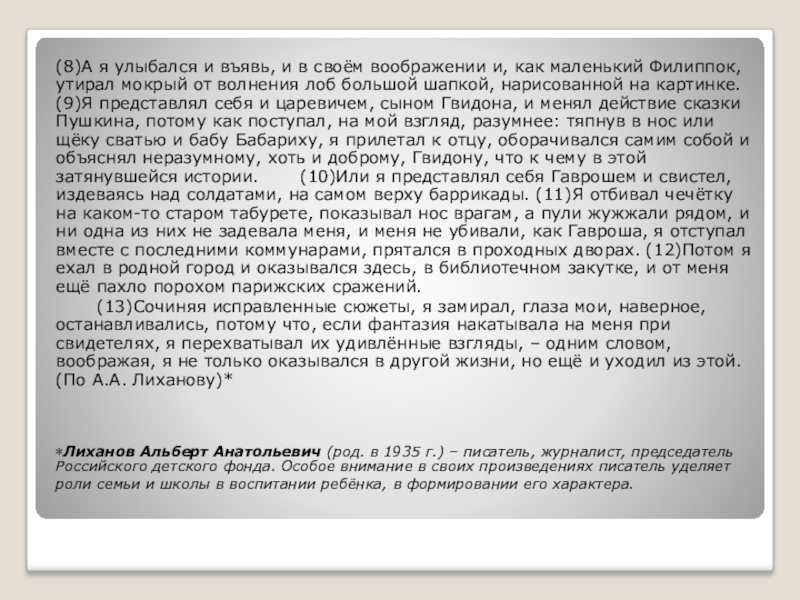 маленький Филиппок, утирал мокрый от волнения лоб большой шапкой, нарисованной на картинке. (9)Я представлял себя и царевичем, сыном Гвидона, и менял действие сказки Пушкина, потому как поступал, на мой взгляд, разумнее: тяпнув в нос или щёку сватью и бабу Бабариху, я прилетал к отцу, оборачивался самим собой и объяснял неразумному, хоть и доброму, Гвидону, что к чему в этой затянувшейся истории. (10)Или я представлял себя Гаврошем и свистел, издеваясь над солдатами, на самом верху баррикады. (11)Я отбивал чечётку на каком-то старом табурете, показывал нос врагам, а пули жужжали рядом, и ни одна из них не задевала меня, и меня не убивали, как Гавроша, я отступал вместе с последними коммунарами, прятался в проходных дворах. (12)Потом я ехал в родной город и оказывался здесь, в библиотечном закутке, и от меня ещё пахло порохом парижских сражений.