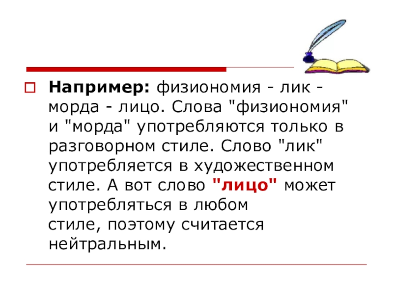 Например: физиономия - лик - морда - лицо. Слова "физиономия" и "морда" употребляются