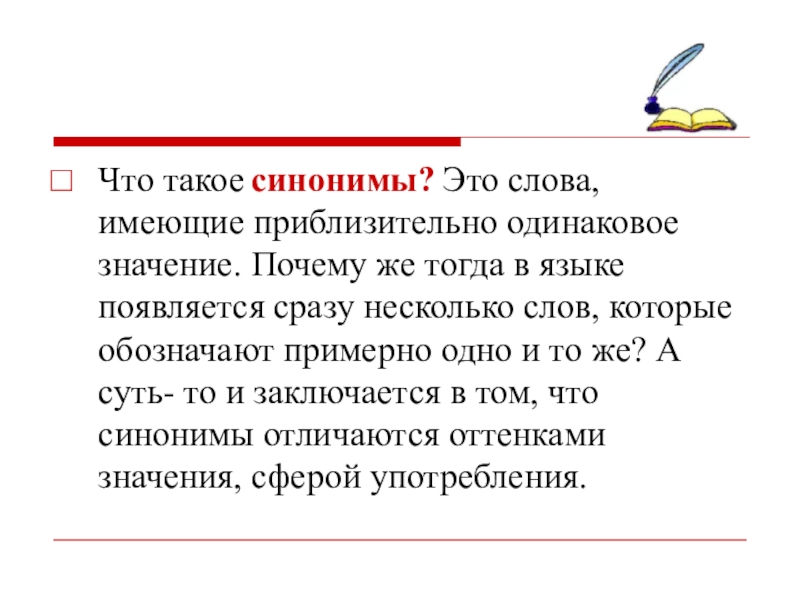Слайд 2Что такое синонимы? Это слова, имеющие приблизительно одинаковое значение. Почему же тогда
