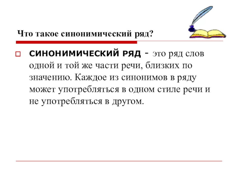 части речи, близких по значению. Каждое из синонимов в ряду может употребляться в одном стиле речи и не употребляться в другом.
