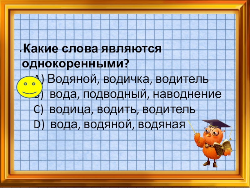 Какие слова являются однокоренными?  A) Водяной, водичка, водитель  B) вода, подводный, наводнение  C)