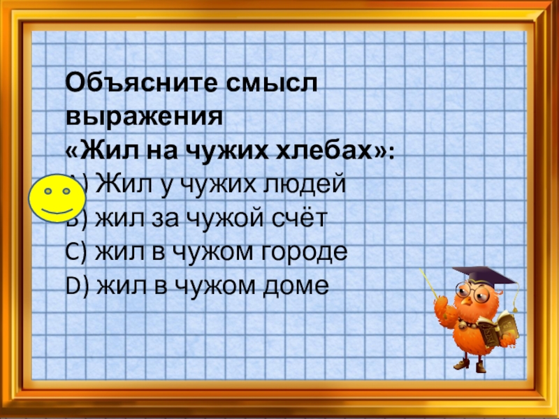 Объясните смысл выражения «Жил на чужих хлебах»: A) Жил у чужих людей B) жил за чужой счёт
