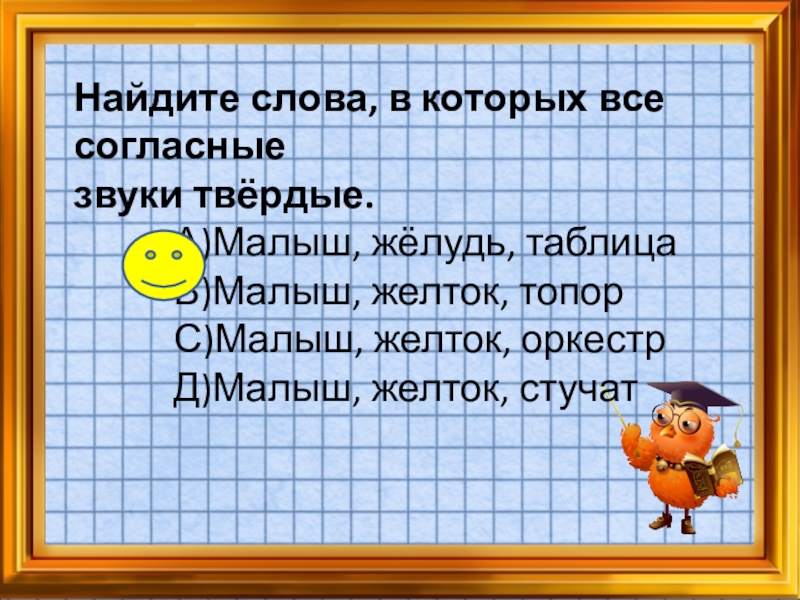 Найдите слова, в которых все согласные звуки твёрдые.      А)Малыш, жёлудь, таблица