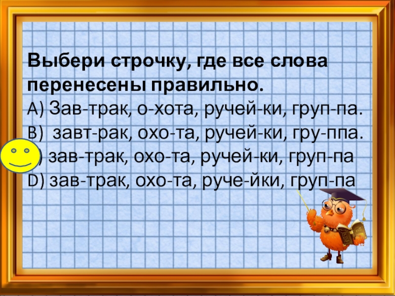 Выбери строчку, где все слова перенесены правильно.A) Зав-трак, о-хота, ручей-ки, груп-па.
