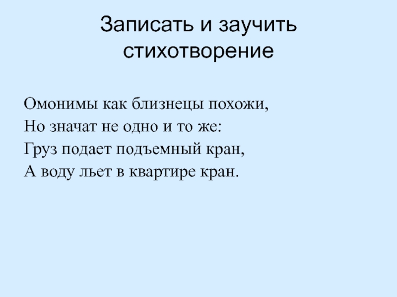 Записать и заучить стихотворениеОмонимы как близнецы похожи,Но значат не одно и то же:Груз подает подъемный кран,А воду
