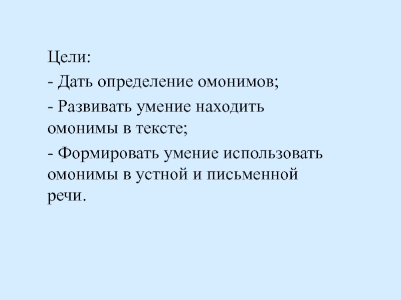 Цели:- Дать определение омонимов;- Развивать умение находить омонимы в тексте;- Формировать умение использовать омонимы в устной и письменной речи.