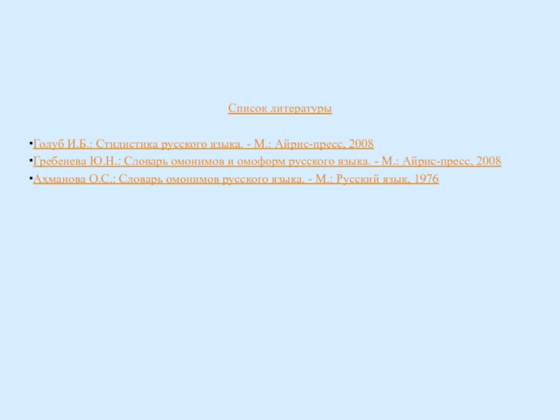 Список литературыГолуб И.Б.: Стилистика русского языка. - М.: Айрис-пресс, 2008Гребенева Ю.Н.: Словарь омонимов и омоформ русского языка.