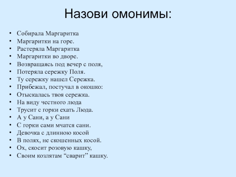 Назови омонимы: Собирала МаргариткаМаргаритки на горе.Растеряла МаргариткаМаргаритки во дворе.Возвращаясь под вечер с поля,Потеряла сережку Поля.Ту сережку нашел