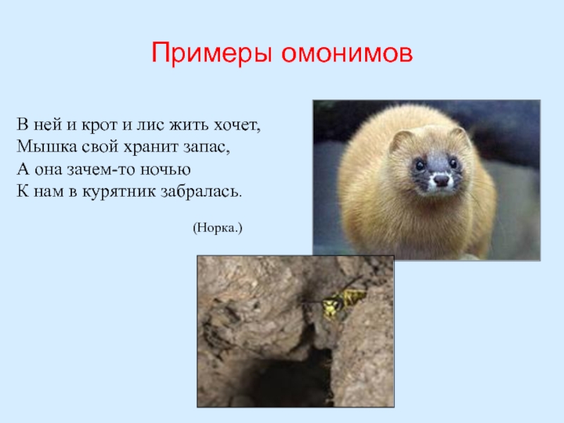Примеры омонимовВ ней и крот и лис жить хочет,Мышка свой хранит запас,А она зачем-то ночьюК нам в