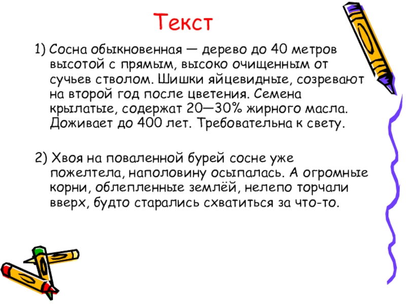 Текст 1) Сосна обыкновенная — дерево до 40 метров высотой с прямым, высоко очищенным от сучьев стволом.