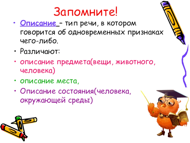 Запомните!Описание – тип речи, в котором говорится об одновременных признаках чего-либо.Различают: описание предмета(вещи, животного, человека)описание места,Описание состояния(человека,