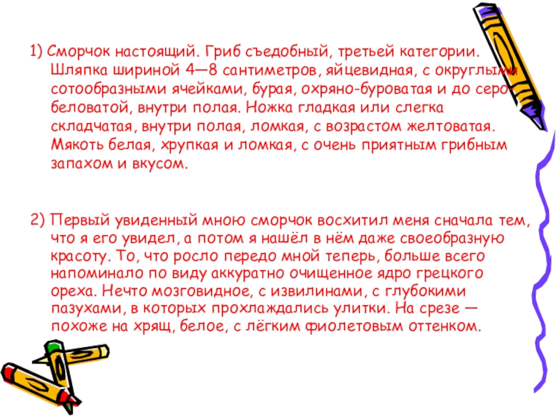 1) Сморчок настоящий. Гриб съедобный, третьей категории. Шляпка шириной 4—8 сантиметров,