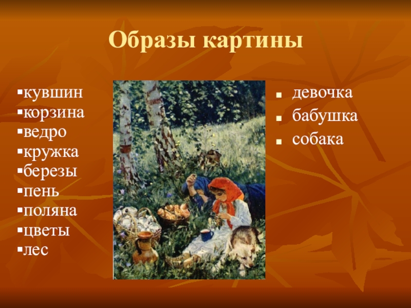 Образы картиныдевочка            бабушкасобакакувшинкорзинаведрокружкаберезыпеньполянацветылес