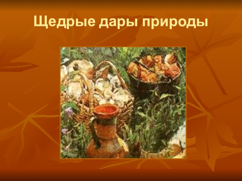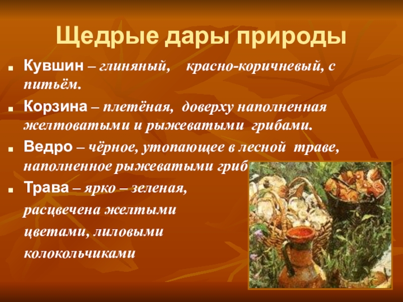 Щедрые дары природыКувшин – глиняный,  красно-коричневый, с питьём.Корзина – плетёная, доверху наполненная желтоватыми и рыжеватыми грибами.Ведро