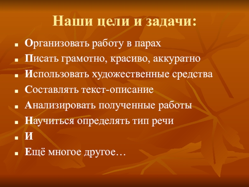 Наши цели и задачи:Организовать работу в парахПисать грамотно, красиво, аккуратноИспользовать художественные средстваСоставлять текст-описаниеАнализировать полученные работыНаучиться определять тип