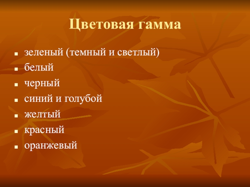 Цветовая гаммазеленый (темный и светлый)белыйчерныйсиний и голубойжелтыйкрасныйоранжевый
