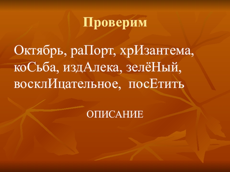 Проверим Октябрь, раПорт, хрИзантема, коСьба, издАлека, зелёНый, восклИцательное, посЕтитьОПИСАНИЕ