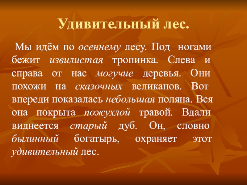 Удивительный лес.	Мы идём по осеннему лесу. Под ногами бежит извилистая тропинка. Слева и справа от нас могучие