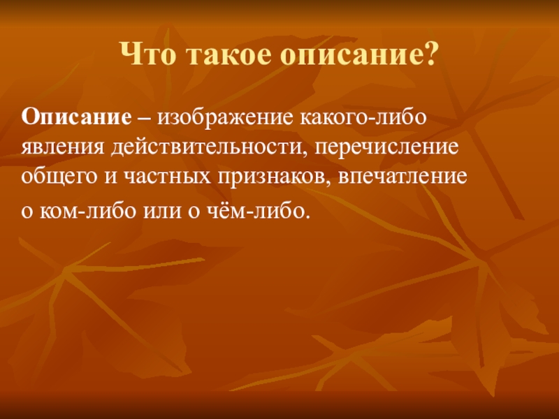 Что такое описание?Описание – изображение какого-либо явления действительности, перечисление общего и частных признаков, впечатление о ком-либо или