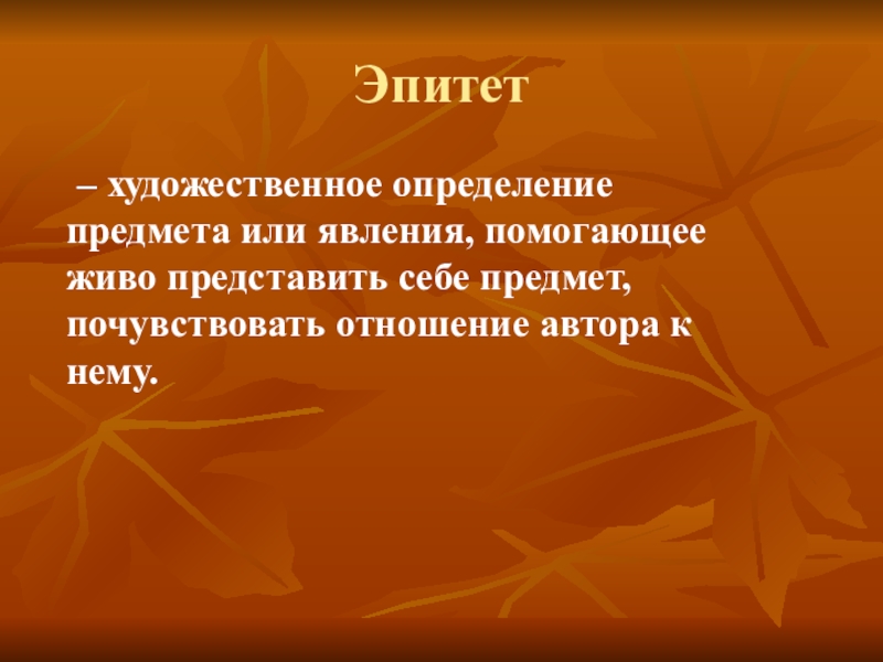 Эпитет	– художественное определение предмета или явления, помогающее живо представить себе предмет, почувствовать отношение автора к нему.