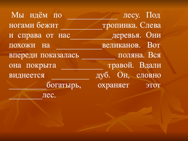 справа от нас__________деревья. Они похожи на ___________великанов. Вот впереди показалась ________ поляна. Вся она покрыта __________ травой. Вдали виднеется _________ дуб. Он, словно _________богатырь, охраняет этот ________лес.