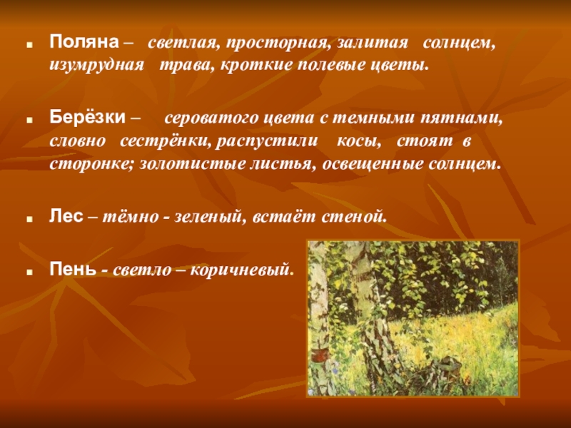 Поляна –  светлая, просторная, залитая  солнцем,  изумрудная  трава, кроткие полевые цветы. Берёзки –